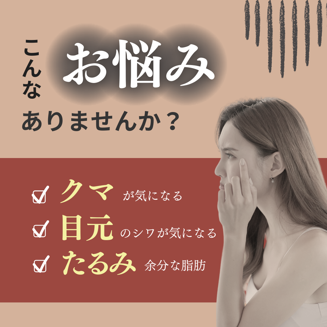 瞼のたるみ、目周りの小じわ、目の下の膨らみ、色グマ・くすみ、こういった目元のお悩みが気になり始めませんか?