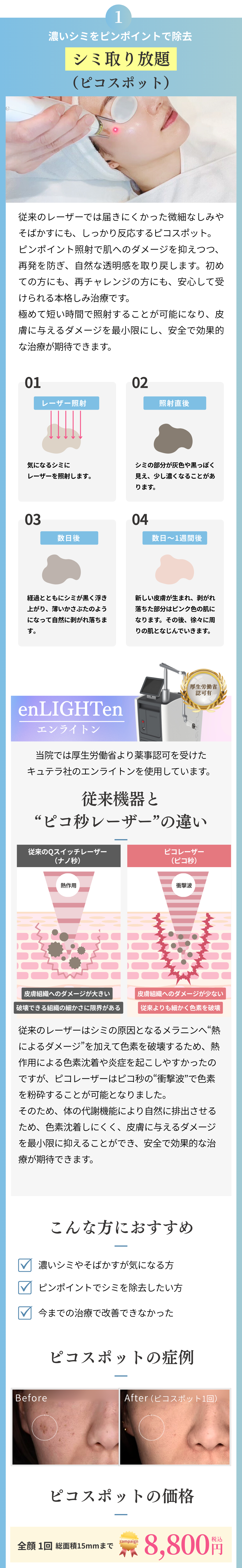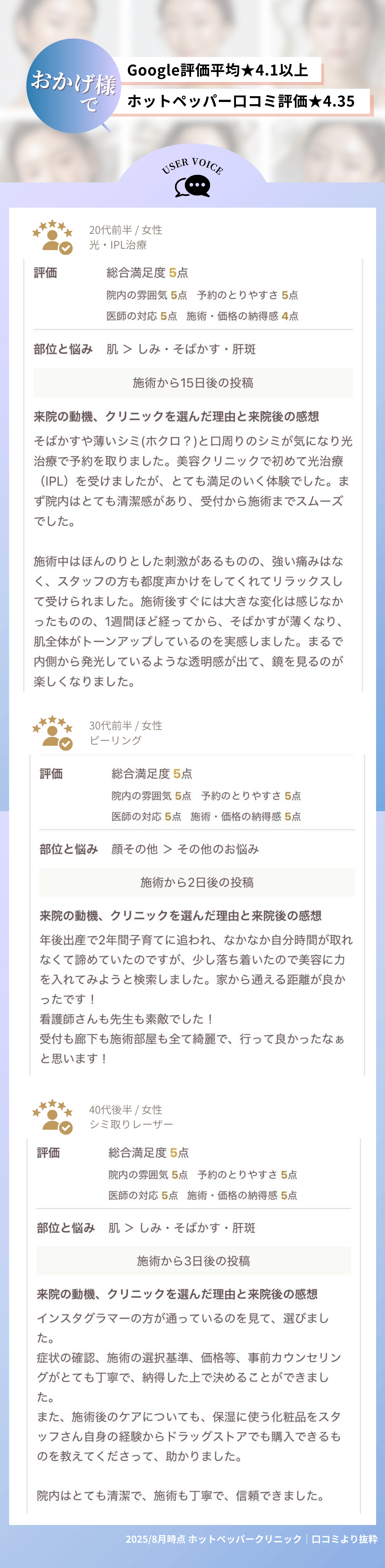 かさぶたが剥がれた後、シミは薄くなっていますが、2~3週間後に褐色調の炎症後色素沈着(PIH)が現れることがあります。PIHは自然経過で消退していきますが、数か月かかることもあります。できるだけPIHが出現しないようにハイドロキノンなどの美白外用剤の併用や生活面での工夫をしていただきます。